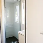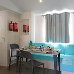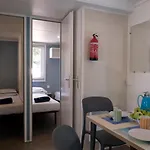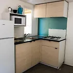 1の寝室のHappy Camp Mobile Homes In Camping Laguna Villageは,アクアフォリエ・ウォ-タ-パ-クから徒歩25分以下です. は座席 と煙探知機が備わり,キチネットが付いています.